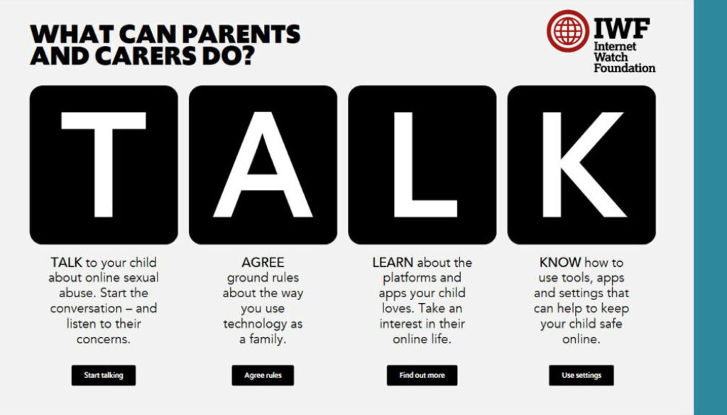 IWF는 마이크로소프트와 함께 TALK 캠페인을 통해 온라인 아동 성착취와 학대의 끔찍한 문제에 대해 사회 전체의 접근이 필요함을 설명하면서 부모들이 온라인 그루밍 범죄의 위험에 대해 자녀에게 끊임없이 T.A.L.K 해야 한다고 강조한다.