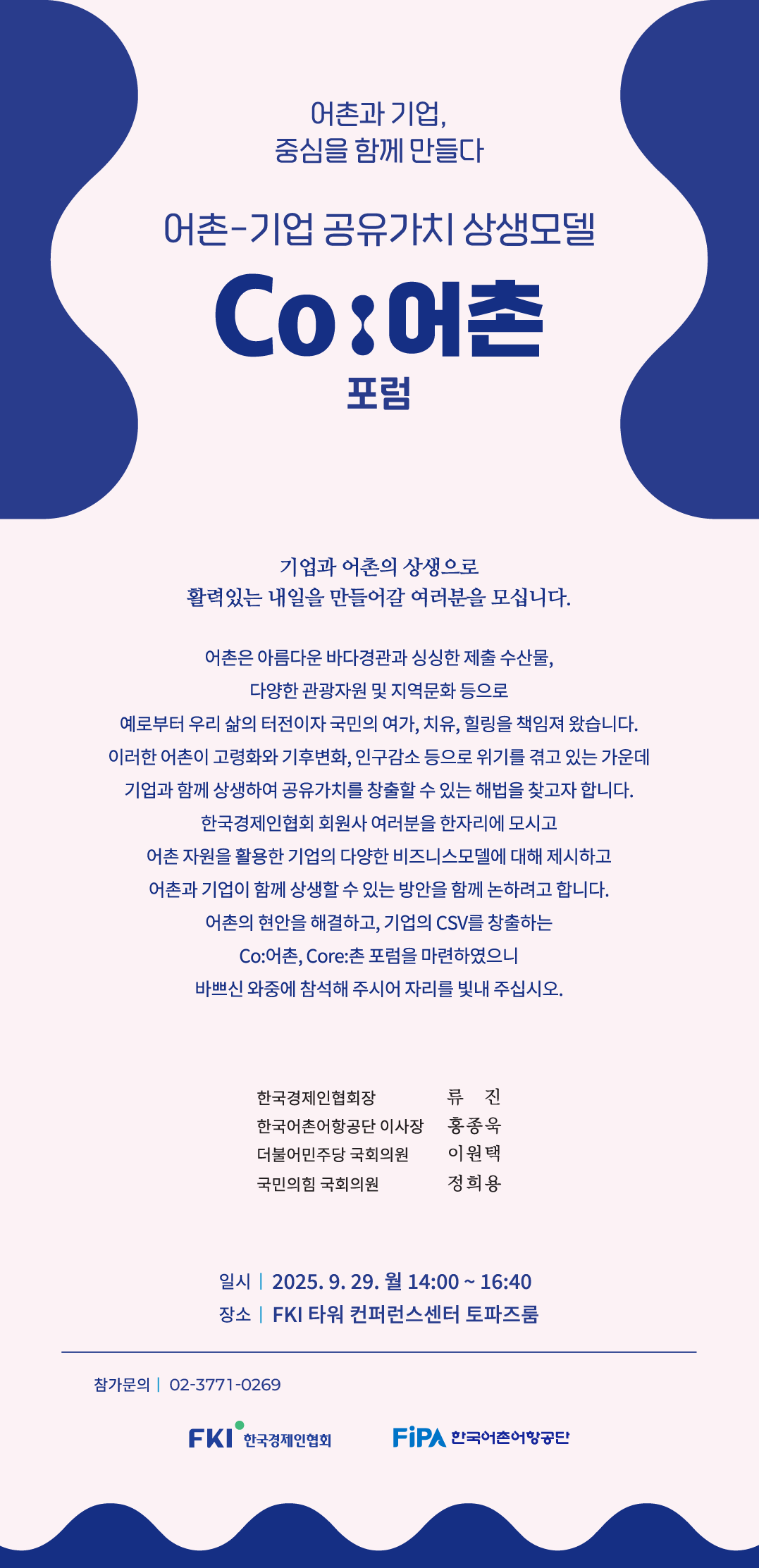 한국경제인협회(이하 한경협)는 오는 9월 29일 FKI타워 컨퍼런스센터에서 '경제계·어촌 상생포럼'을 개최한다. 이번 포럼은 한경협과 국회 농림축산식품해양수산위원회 간사인 이원택·정희용 의원실, 한국어촌어항공단이 공동 주최한다.